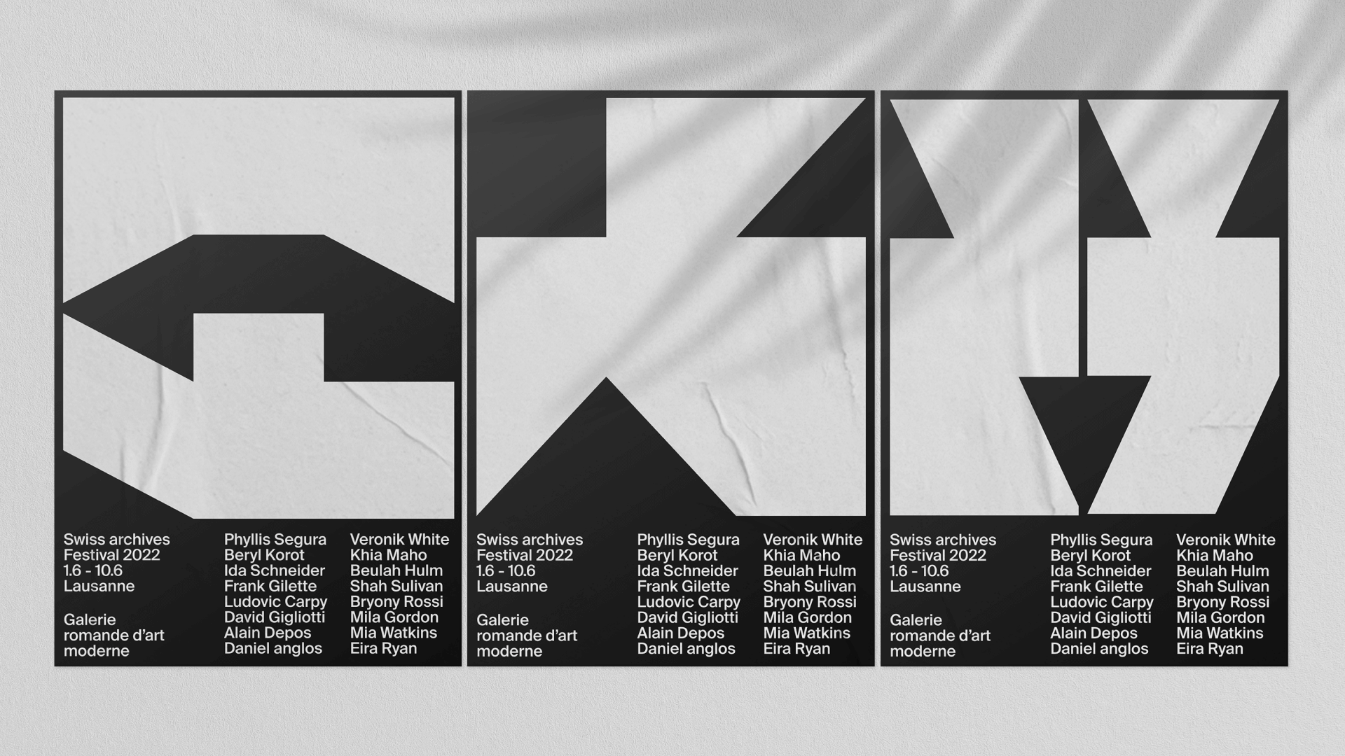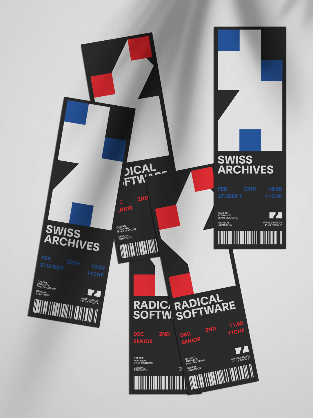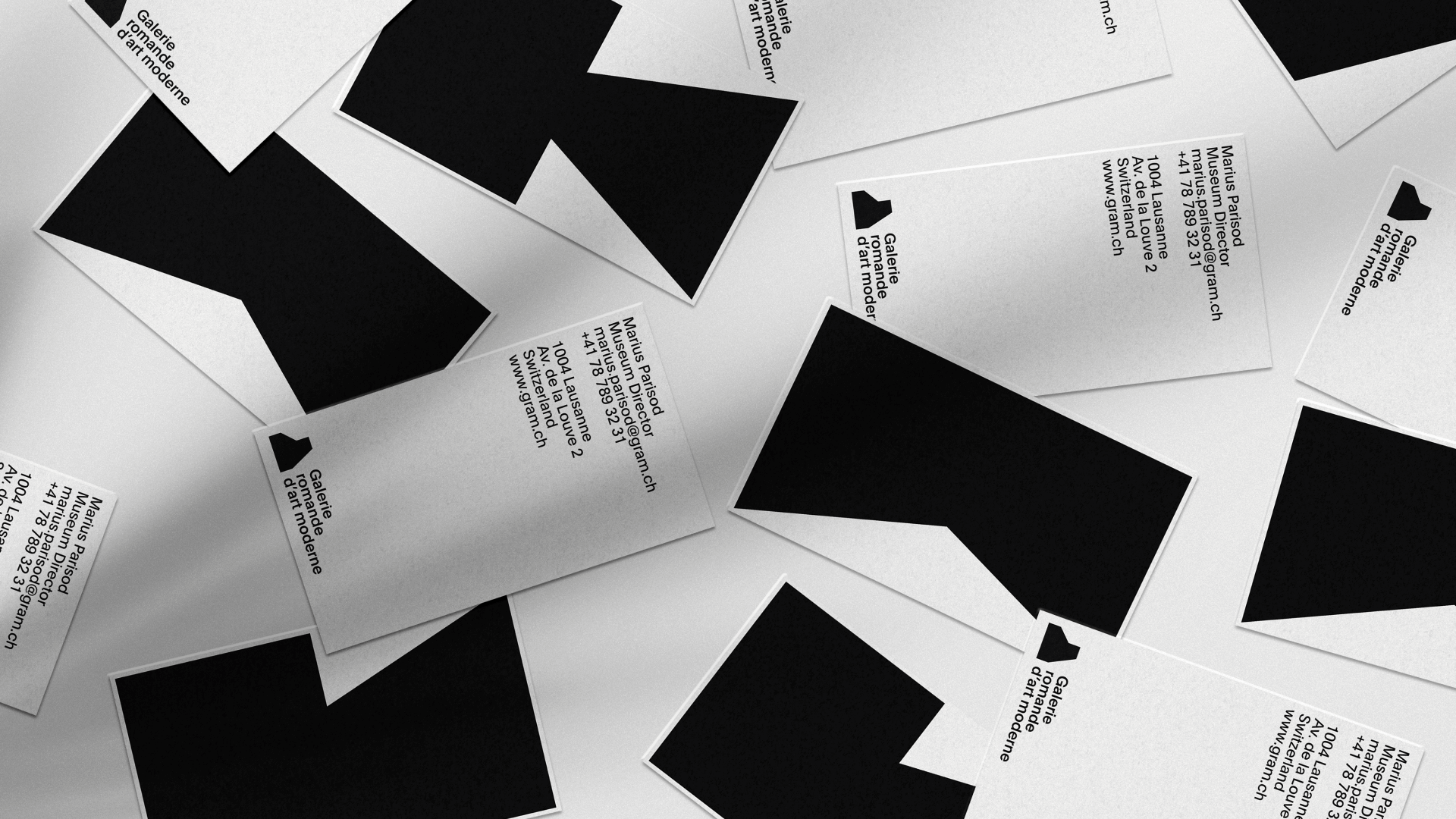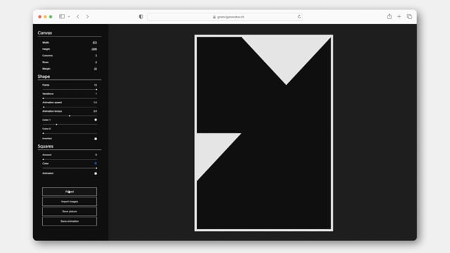 Dynamic brand identity for the fictional Galerie Romande d'Art Moderne. The aim of this project was to develop a tool that effortlessly generates a wide range of graphic materials for an artistic institution. With this tool, users can define basic rules to create abstract shapes that consistently adhere to a unified visual typology. These shapes can be exported as images, used as masks, or animated.
